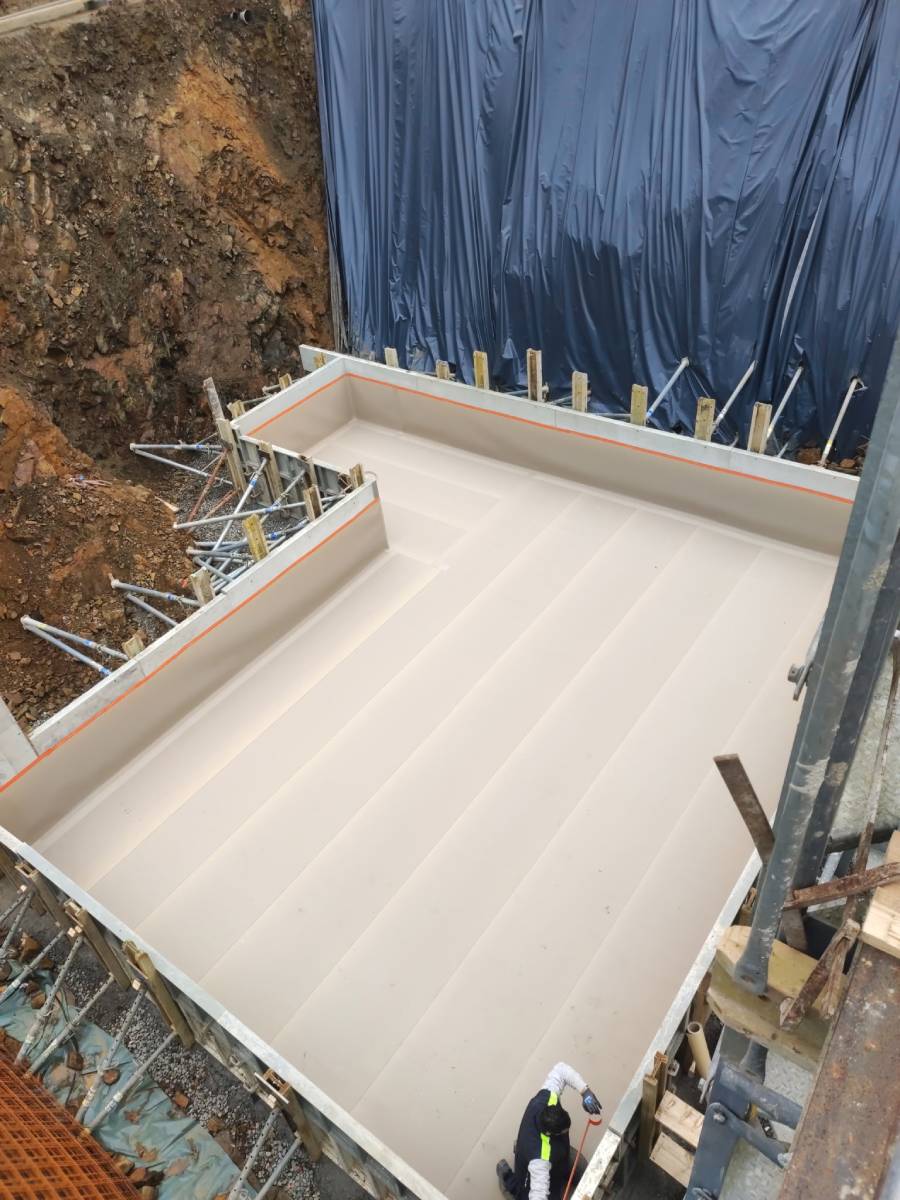 Pour ce chantier, nous avons privilégié des solutions d’étanchéité de haute performance, garantissant une barrière continue et durable sur l’ensemble des fondations. Ce procédé assure à la fois la prévention des infiltrations et la résistance mécanique de la structure.