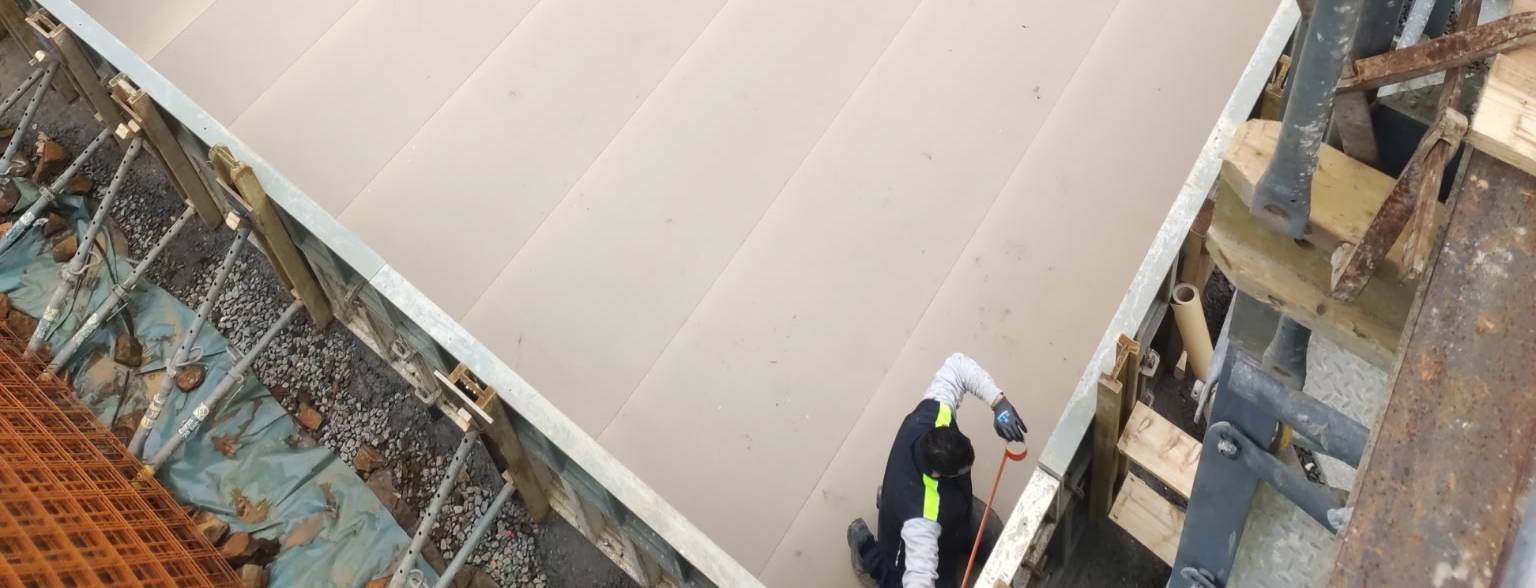 Cette fois-ci, la membrane d’étanchéité est posée après le coulage du béton. Nous avons utilisé le SikaProof P-12. Ce géo-composite adhérent auto-appliqué s’utilise sur les structures en béton pré-existantes. Il s’applique à froid, sur simple collage après avoir enlevé le film de protection. On utilise le primaire SikaProof Primer-01 à base de résine de caoutchouc synthétique pour permettre une bonne consolidation du béton et améliorer la capacité d’adhérence du SikaProof P-12.